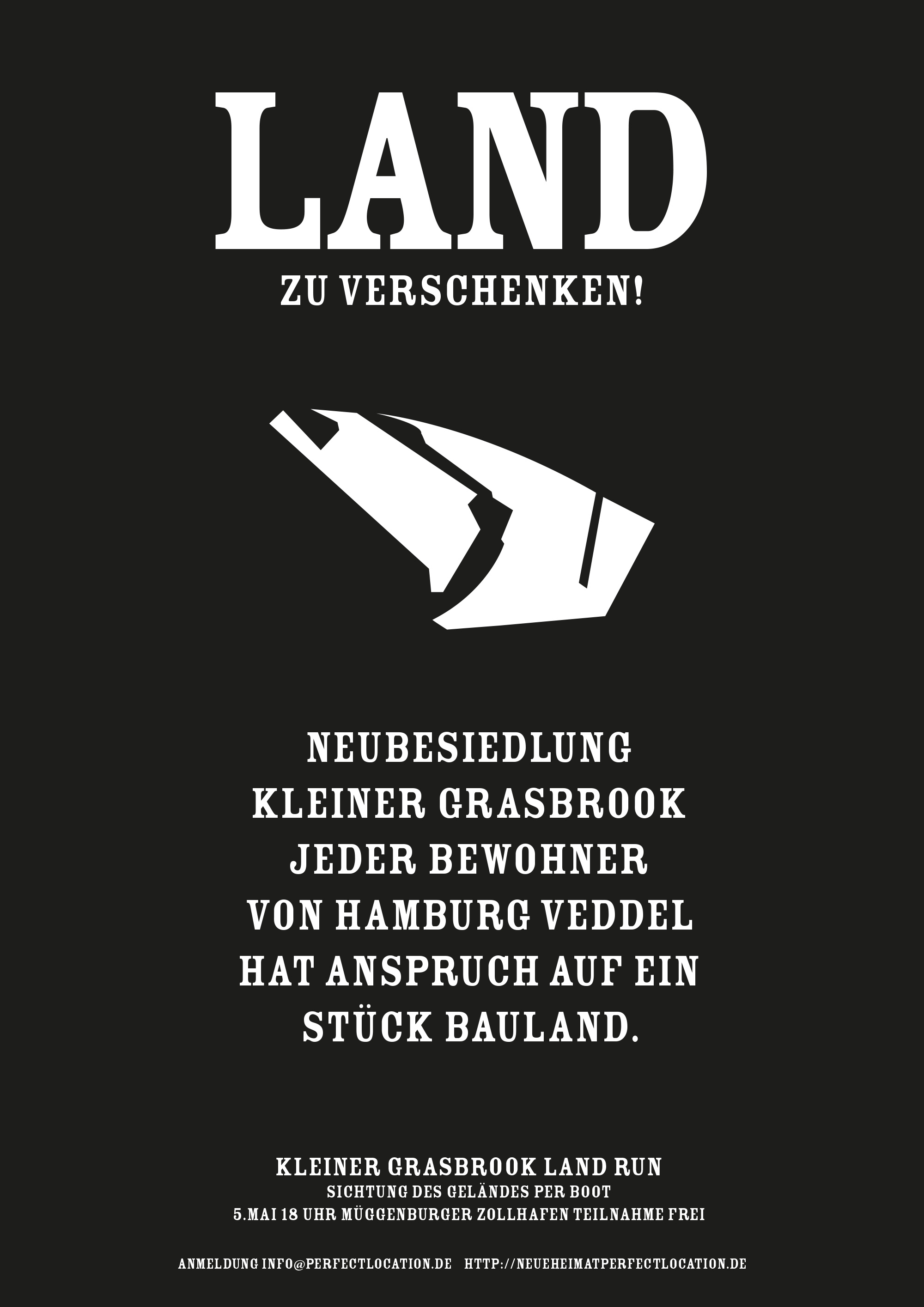 LAND RUN besetzt dieses Gelände mit einem spekulativen Szenario: Nach dem Fall der Zollschranken wird die Nachbarinsel Kleiner Grasbrook parzelliert und an BewohnerInnen der Veddel verschenkt. Ein Datum wird festgelegt, der Startschuss fällt, Claims werden abgesteckt – und Bauland wechselt den Besitzer.