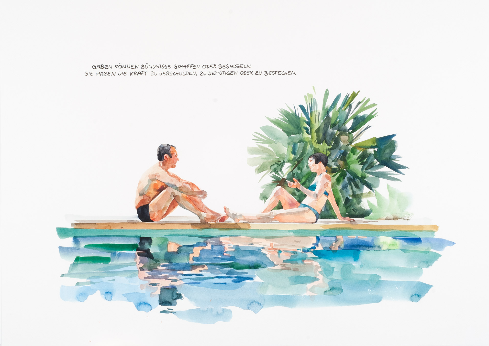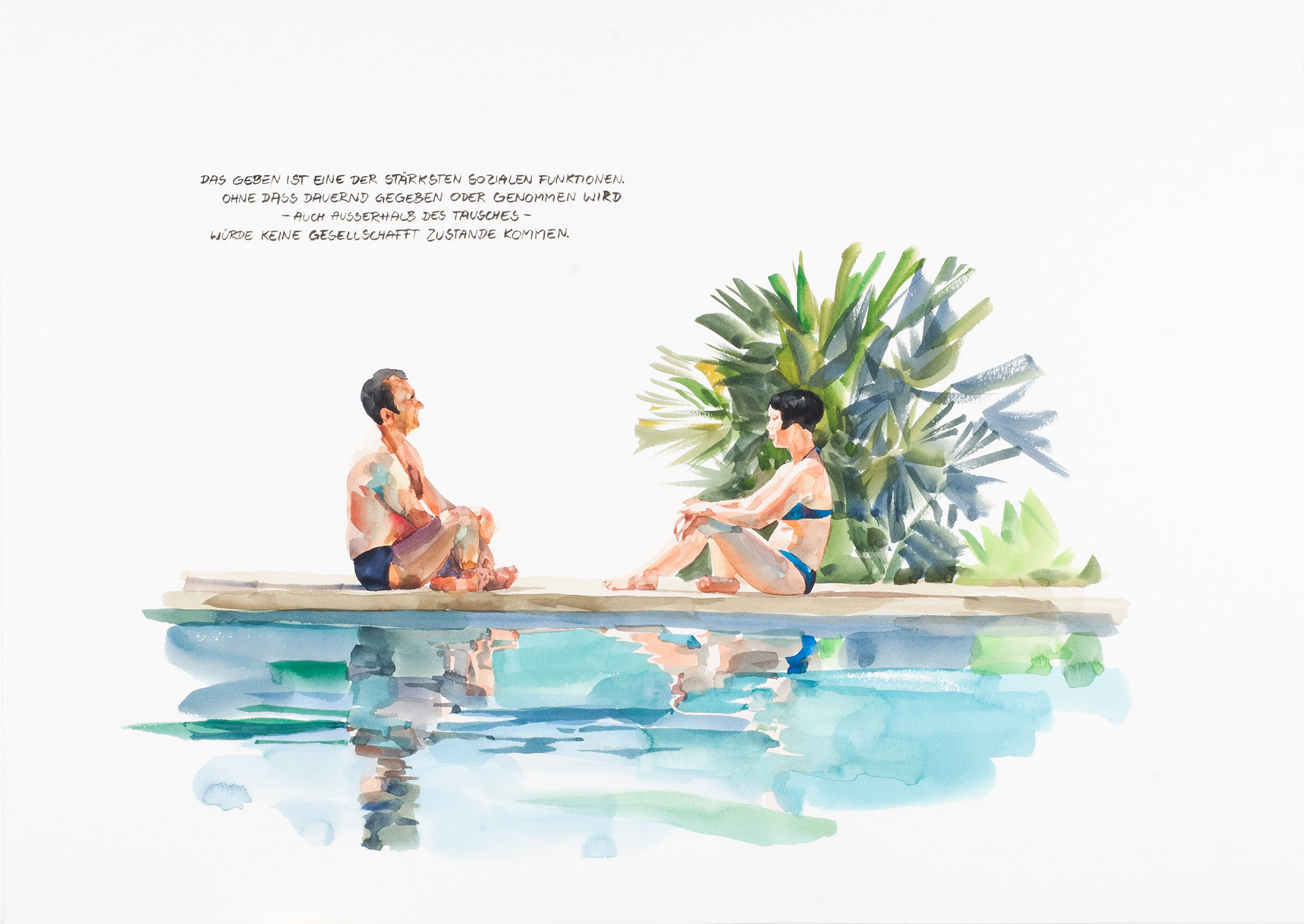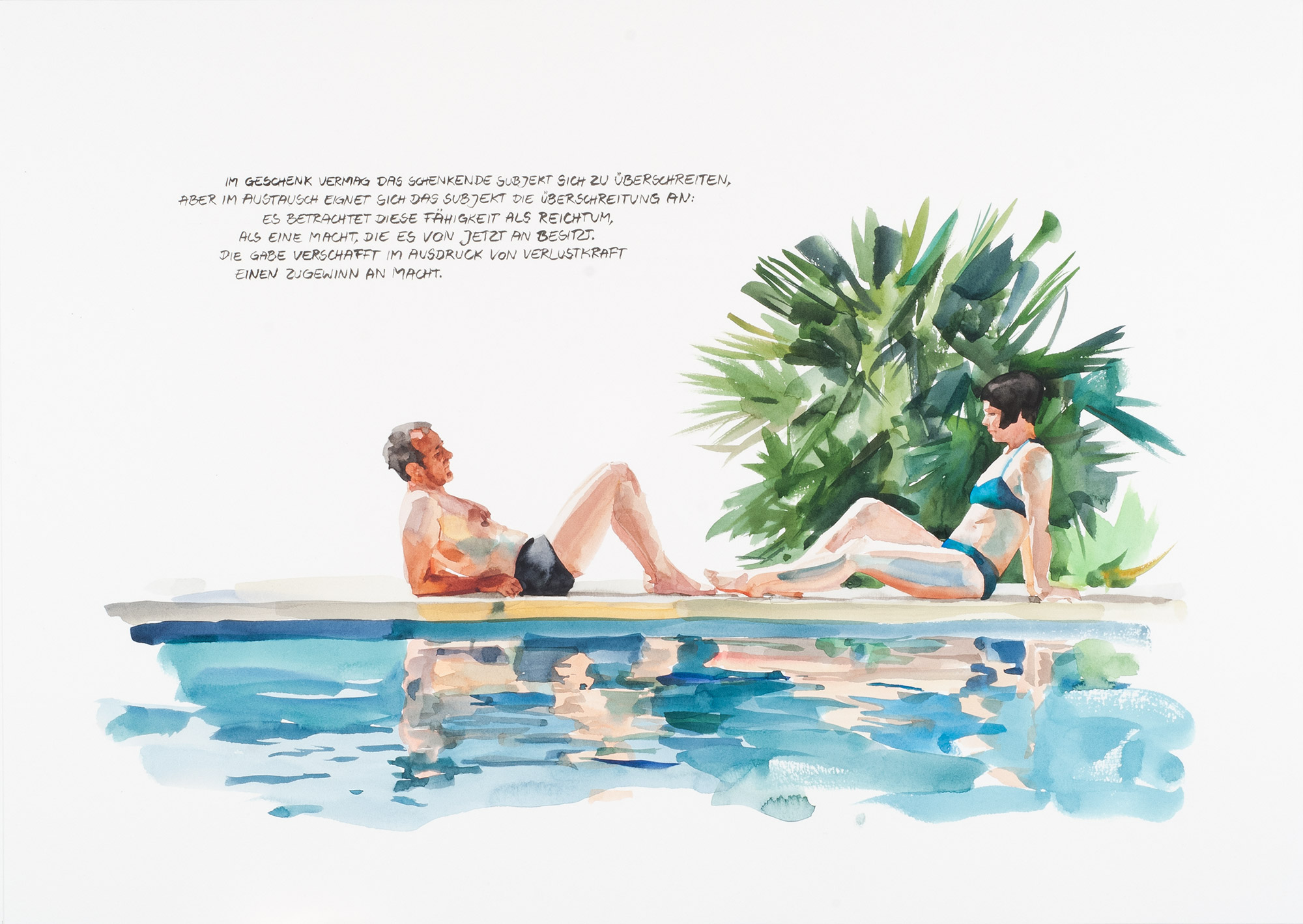 Aus dieser Lektüre entstand eine Reihe von sieben Aquarellen, die uns in Badehose und Bikini am Pool zeigen, in konzentriertem Gespräch. Konzeptuell begreifen die Aquarelle den Pool als Denkraum: Als Ort der Muße, an dem die ökonomischen und symbolischen Dimensionen des Schenkens – wie sie Mauss beschreibt – nicht nur gelesen, sondern performativ eingeholt werden. Die Darstellung von uns selbst in Badehose und Bikini übersetzt diese Reflexion in ein Bild des „unausgesetzten Zirkulierens“: von Wasser, Wärme, Blicken, Gedanken.