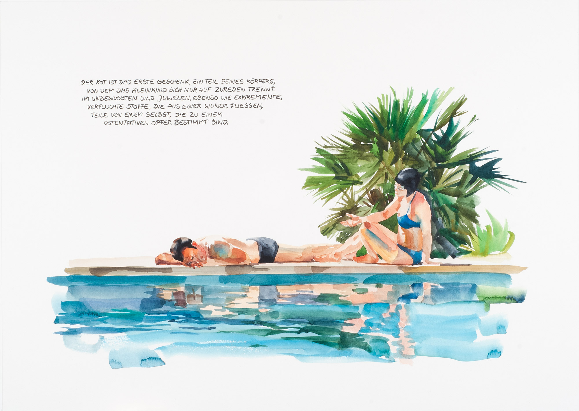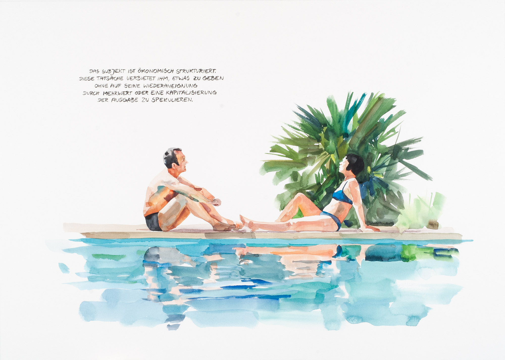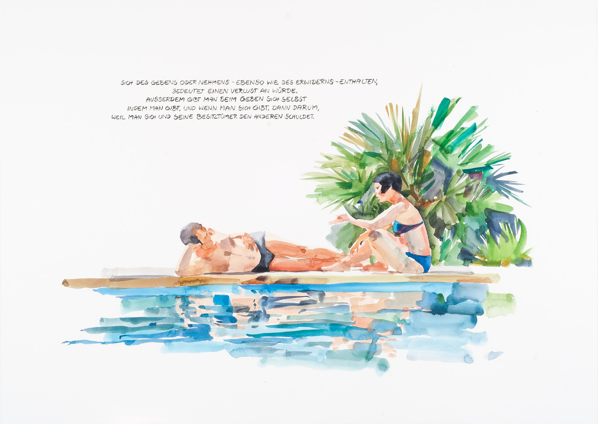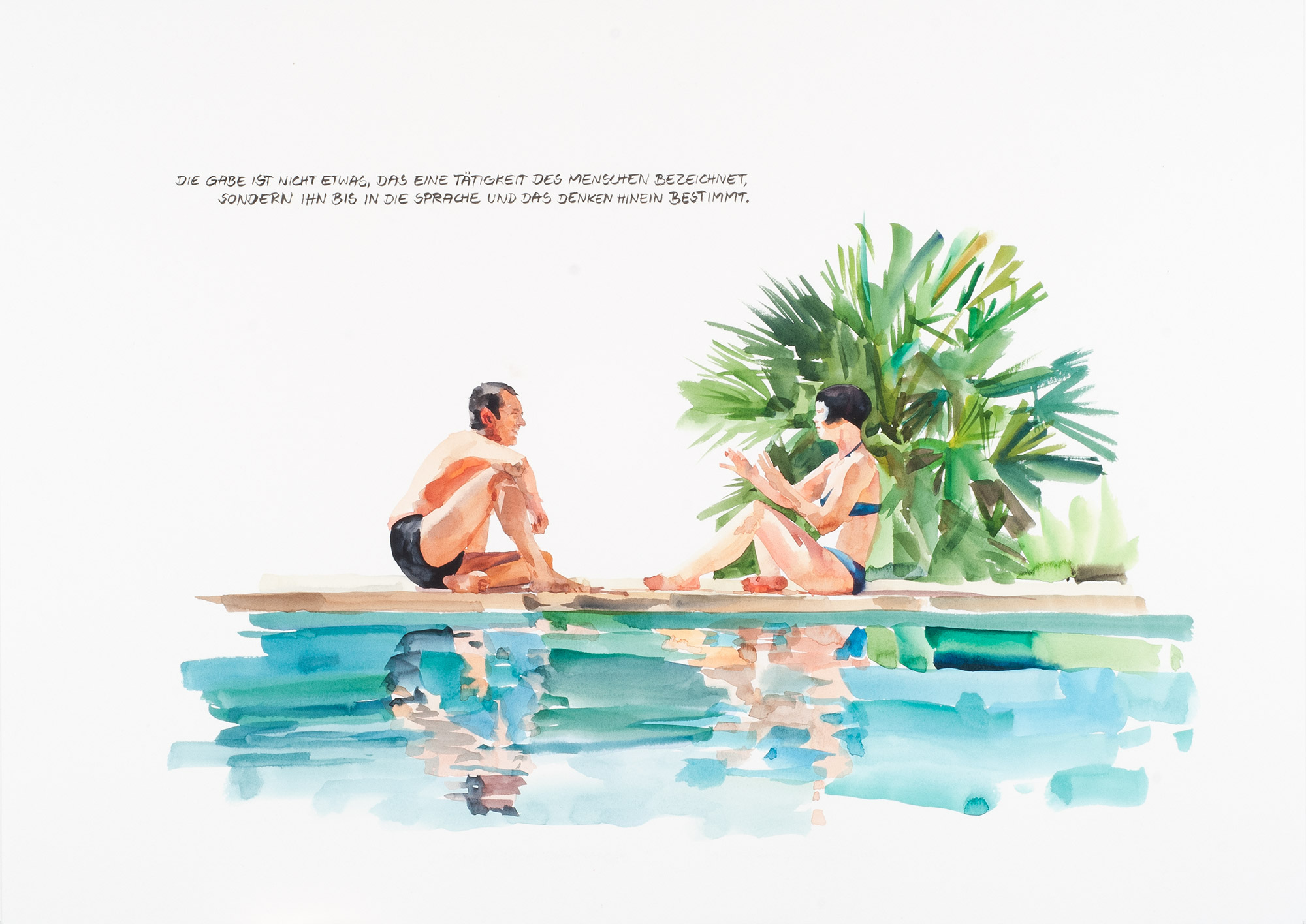 Aus dieser Lektüre entstand eine Reihe von sieben Aquarellen, die uns in Badehose und Bikini am Pool zeigen, in konzentriertem Gespräch. Konzeptuell begreifen die Aquarelle den Pool als Denkraum: Als Ort der Muße, an dem die ökonomischen und symbolischen Dimensionen des Schenkens – wie sie Mauss beschreibt – nicht nur gelesen, sondern performativ eingeholt werden. Die Darstellung von uns selbst in Badehose und Bikini übersetzt diese Reflexion in ein Bild des „unausgesetzten Zirkulierens“: von Wasser, Wärme, Blicken, Gedanken.
